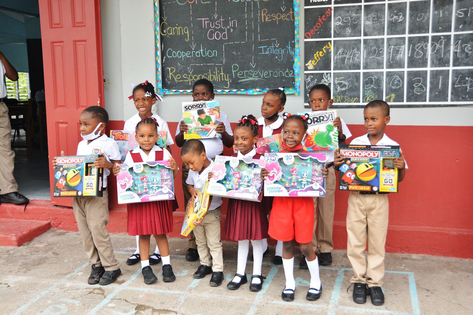 Top picture: A classroom of excited children in Grenada holding their newest toys from the Sandals Foundation and Hasbro.